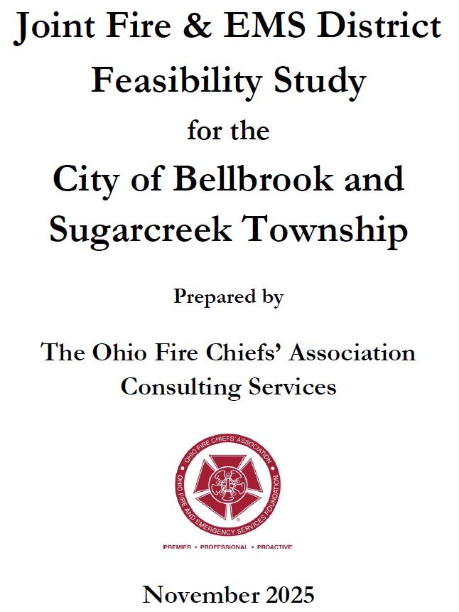 The City of Bellbrook and Sugarcreek Township recently contracted with the Ohio Fire Chief's Association to conduct a feasability study for creating a joint Fire and EMS District. The Study has just been released and will be reviewed for suggestions and deliberation of any next steps. At this time, the information gathered reveals there is no cost effective method to create a formal district without increasing the cost and potentially reducing services to Bellbrook residents.