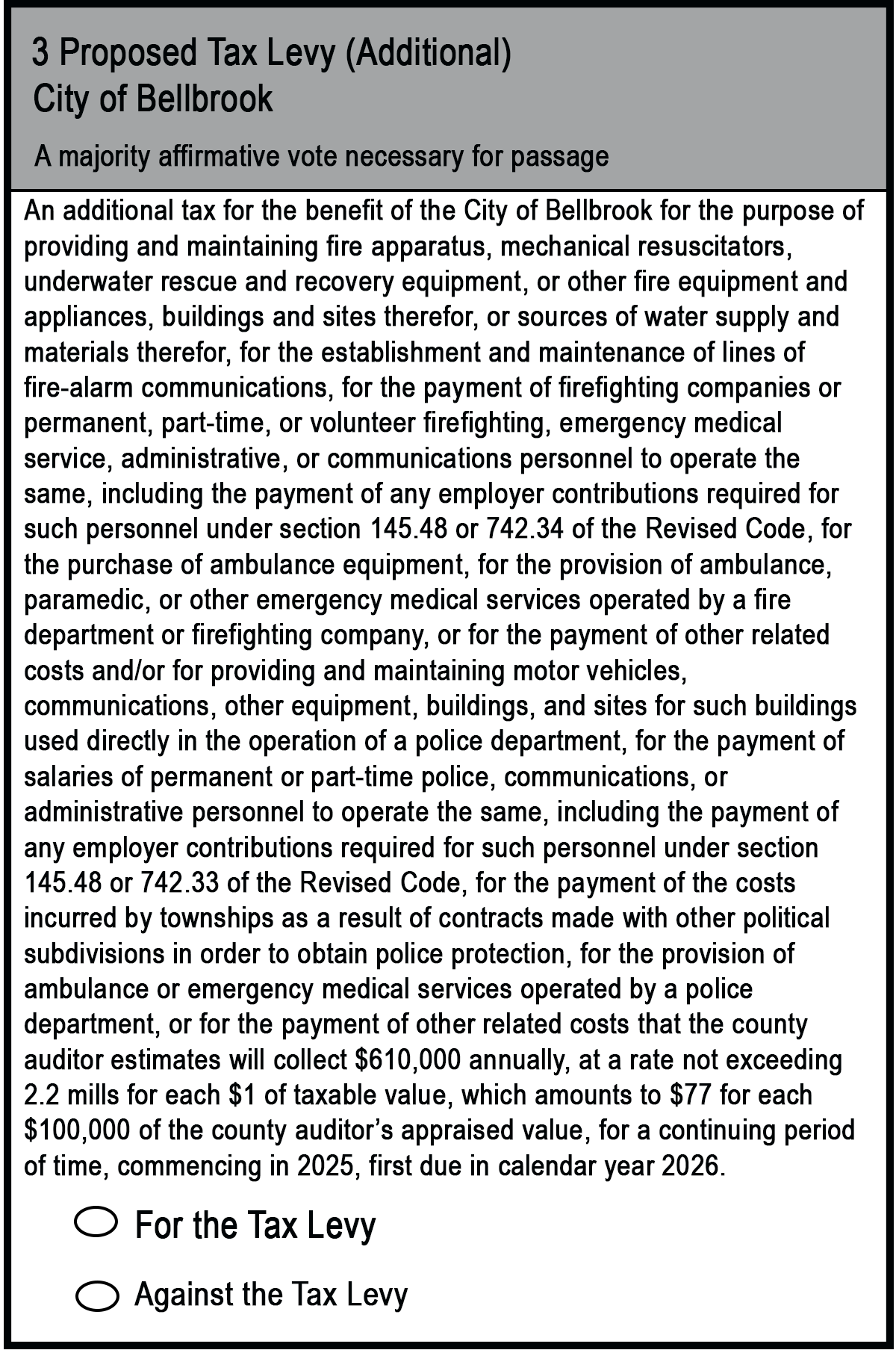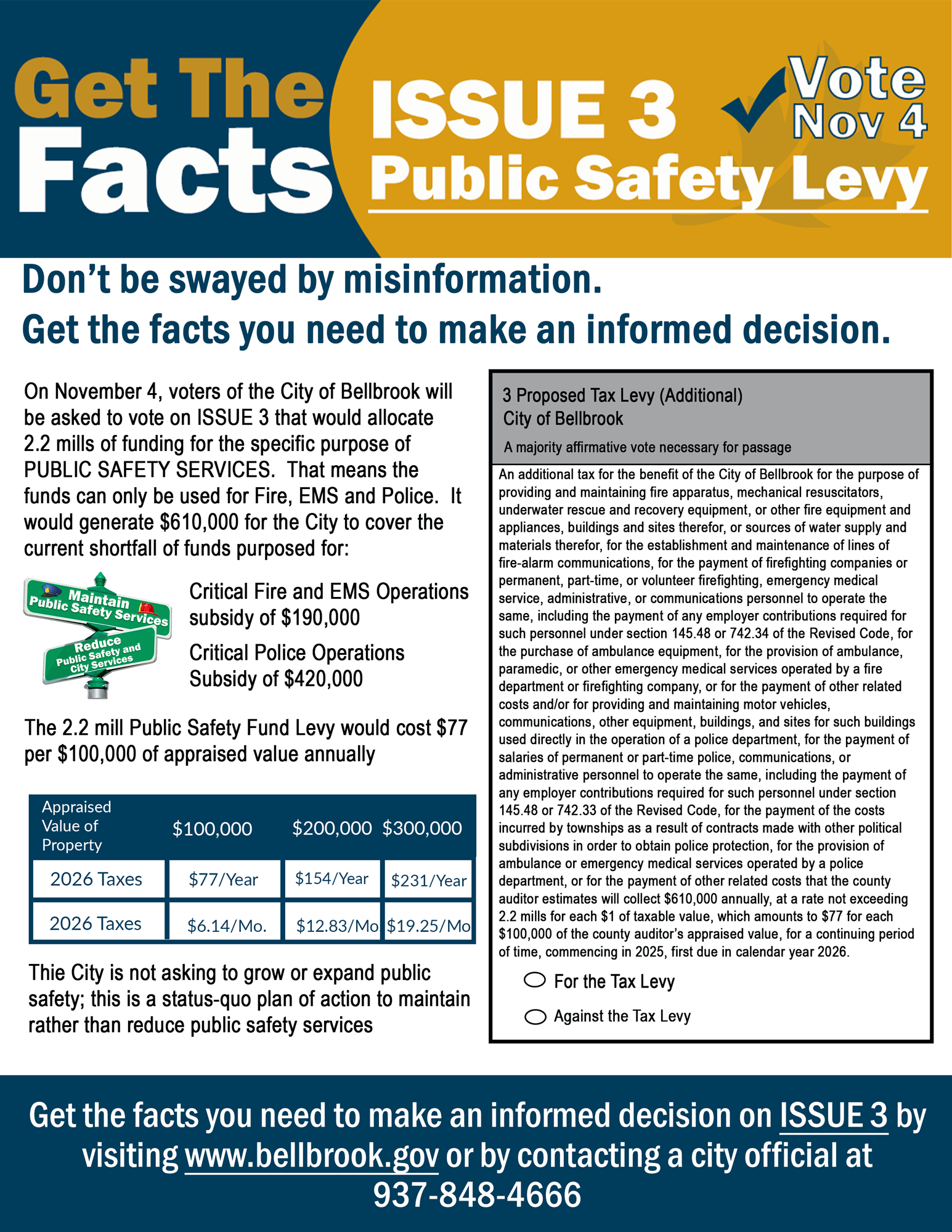 On November 4, voters of the City of Bellbrook will be asked to vote on an ISSUE that would allocate 2.2 mills of funding for the specific purpose of Public Safety Services. That means the funds can only be used for Police, Fire, and EMS. It will generate $610,000 for the City to cover the current shortfall of funds purposed for: